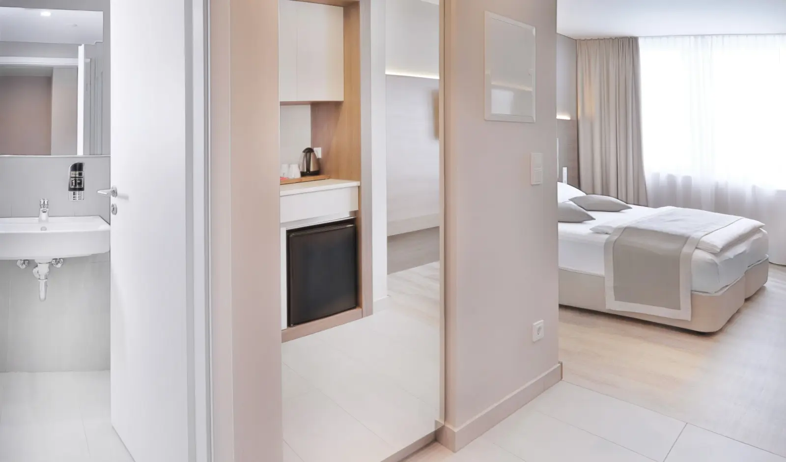 - Kitchenette mit Spüle, Wasserkocher und Minibar
